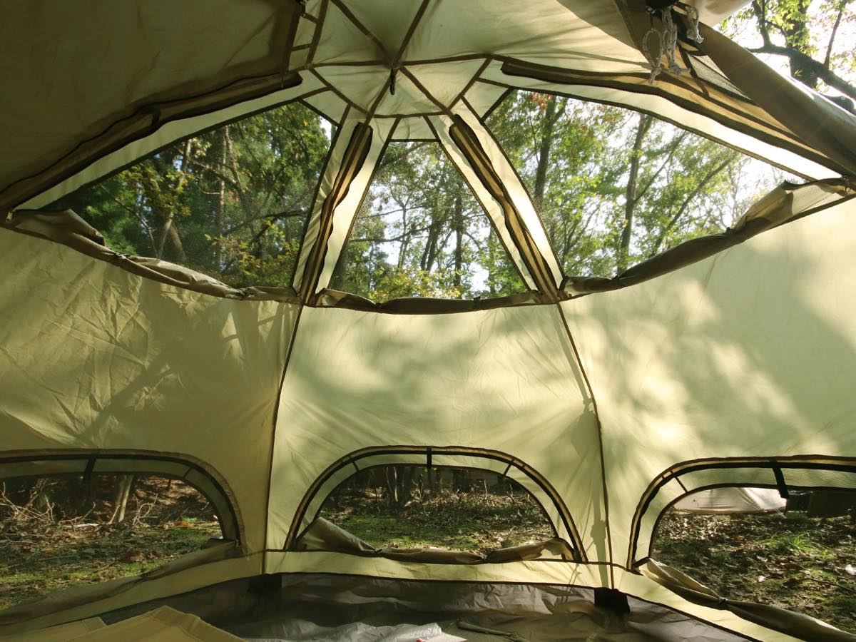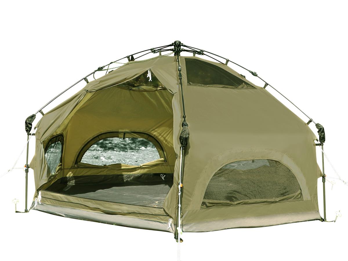 安定性の高い6本脚構造で、インナーテント部は大きく開く入口と、換気調整が行えるメッシュ窓を壁面と天井部に採用(テント地で窓を閉じられます)。その時の気温や気候、状況に合わせて、テント内を快適な環境に保てます。