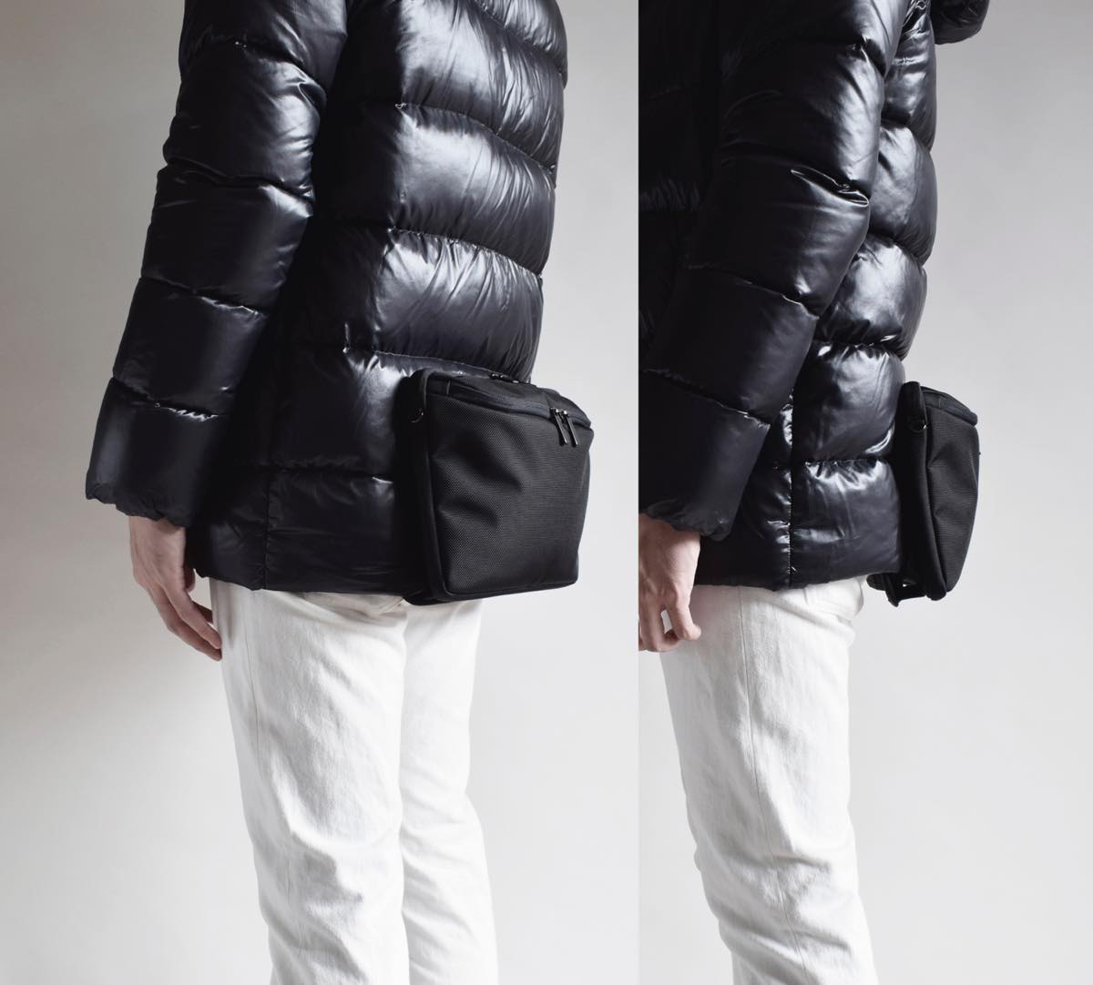しかも、このウエストバッグ、特殊構造で上着の裾が入る “隙間” がつくられているので、シャツやジャケット、ダウンなどのシルエットを崩さず着られるようになっています。上着の外側にバッグ本体がくるので、まるで浮いているように見えるという、かなり斬新なデザイン。