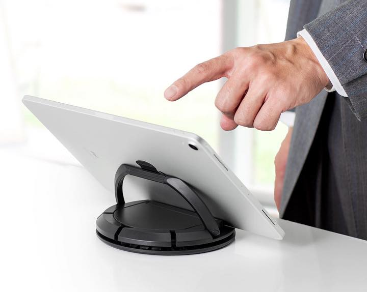 お客との商談の際に、タブレットを見せながら説明する光景はすっかりおなじみになりました。最近ではレジの代わりにタブレットやスマホを用いる店舗も増えています。そんな時、あったら便利なのがデバイスを立てかけられるスタンド。