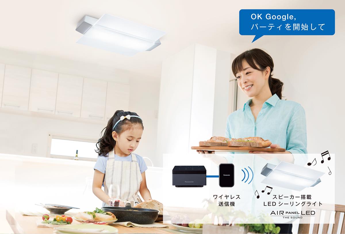 もちろん、Google アシスタント対応機器も通常通り操作でき、なかでもパナソニックのイチオシがLEDシーリングライト「AIR PANEL LED THE SOUND」との独自連携です。Bluetooth機能を使って音声で「あかりの操作」と「光と音の一括操作」ができ、たとえば「OK Google,くつろぎを開始して」などと話しかければシーンにあわせた光と音が天井から降り注ぐのだそう。