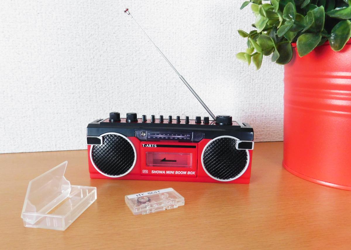 「昭和ミニラジカセ」(5480円/税別)は、切替スイッチと選局ダイヤルでAM・FMのラジオが聴けるミニラジオ。同梱の透明ミニカセットテープを本体にセットすれば録音モードが作動、外部音声やラジオ番組を本体に録音できるようになっています。
