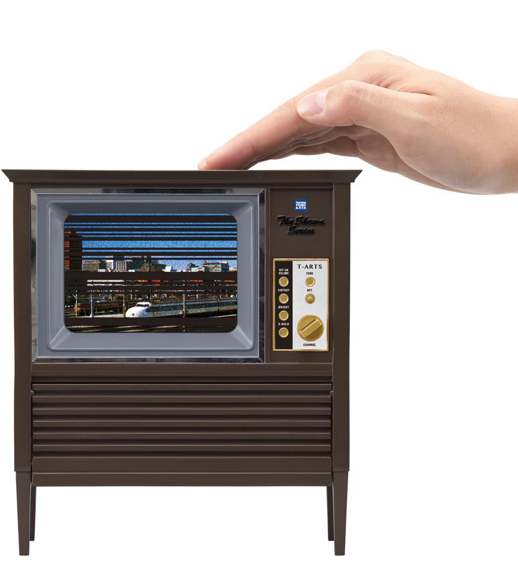 脚付の家具調テレビ「昭和スマアトテレビジョン」(3980円/税別)は、手持ちのスマホに専用アプリをインストールして本体内側にセットするだけで、昭和のお茶の間ムードでスマホ動画を楽しめるというグッズ。