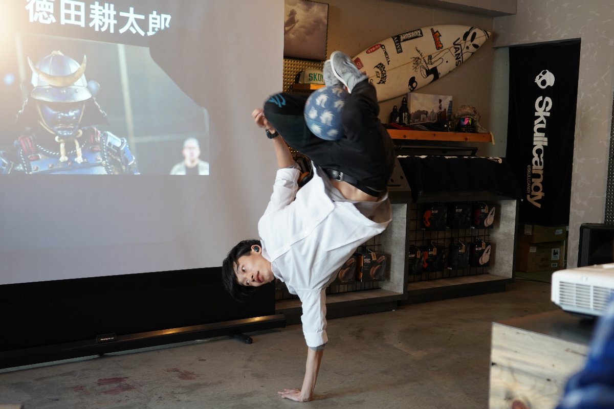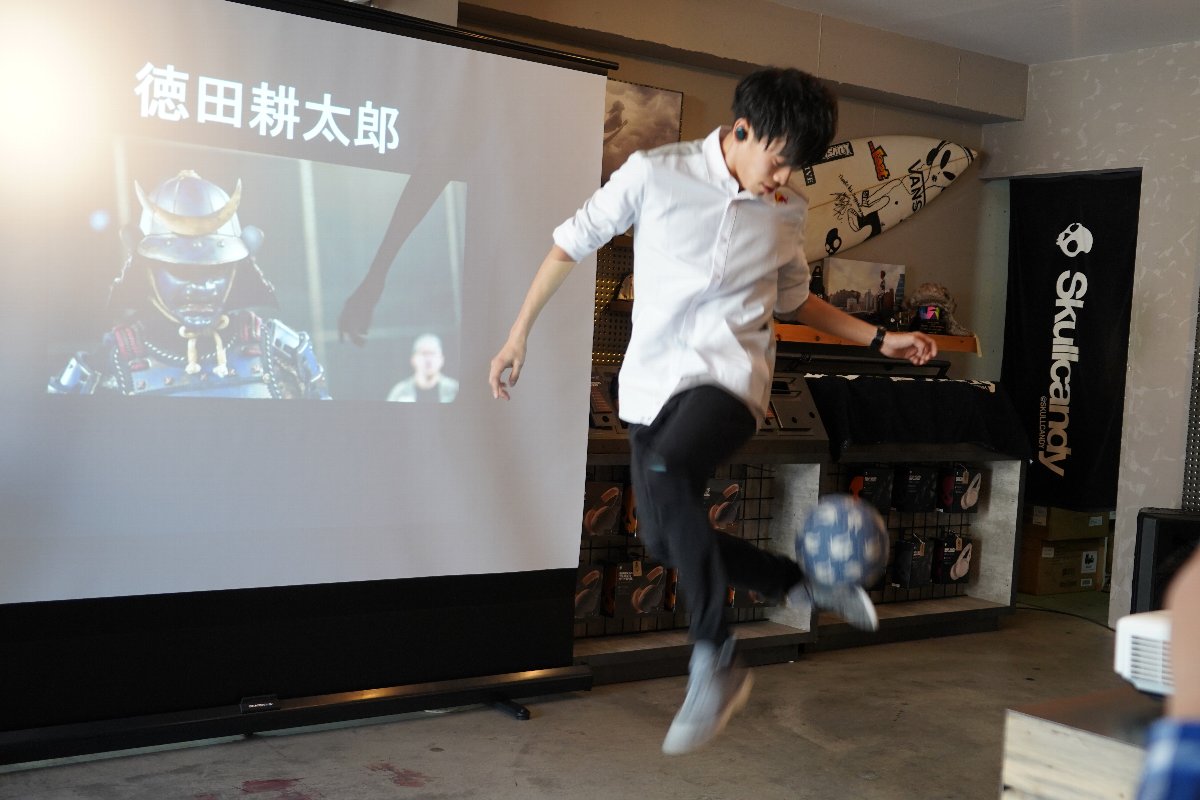 ▲発表会の会場では、SkullCandy契約するフリースタイルフットボーラーの徳田耕太郎さんが、「PUSH」を装着したままパフォーマンスを披露