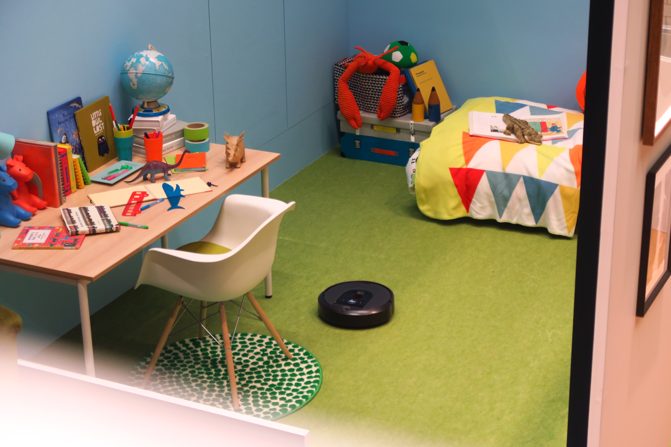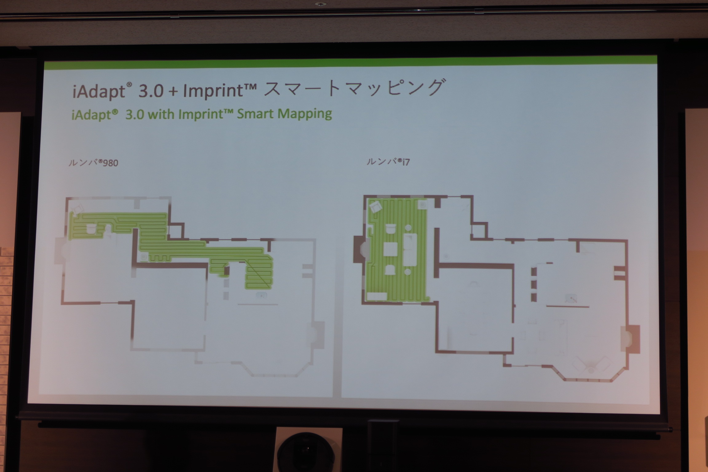 これは「Imprint スマートマッピング」という機能で、2〜3回掃除をするだけで搭載するカメラとフロアトラッキングセンサーなどから間取りを把握し、ルンバ自身が家のなかのどこにいるのかを理解します。もちろん、頻繁に動かす家具の位置などを完璧に覚えるわけではないですが、精度としては80%ほど覚えてくれるそうです。