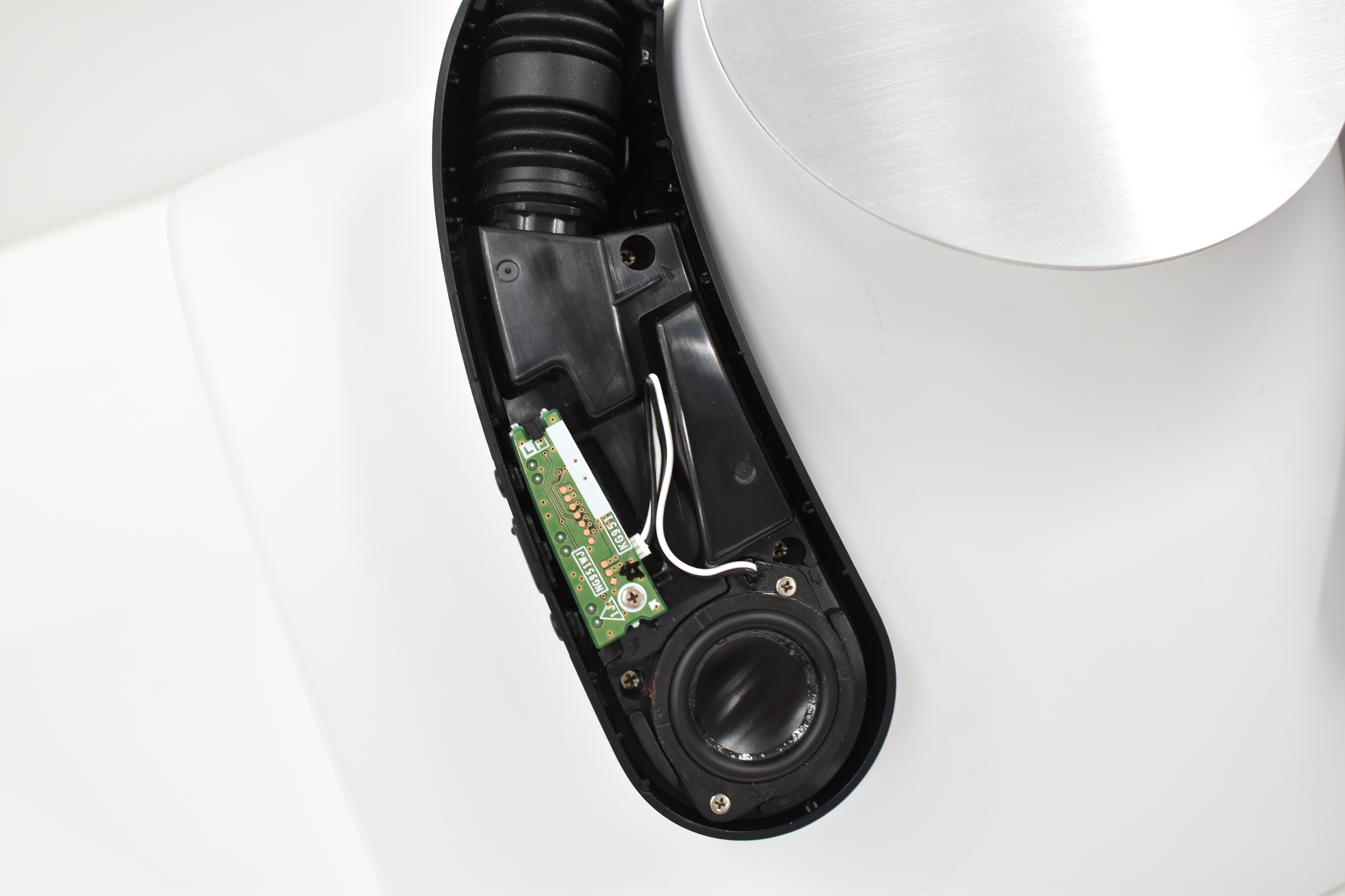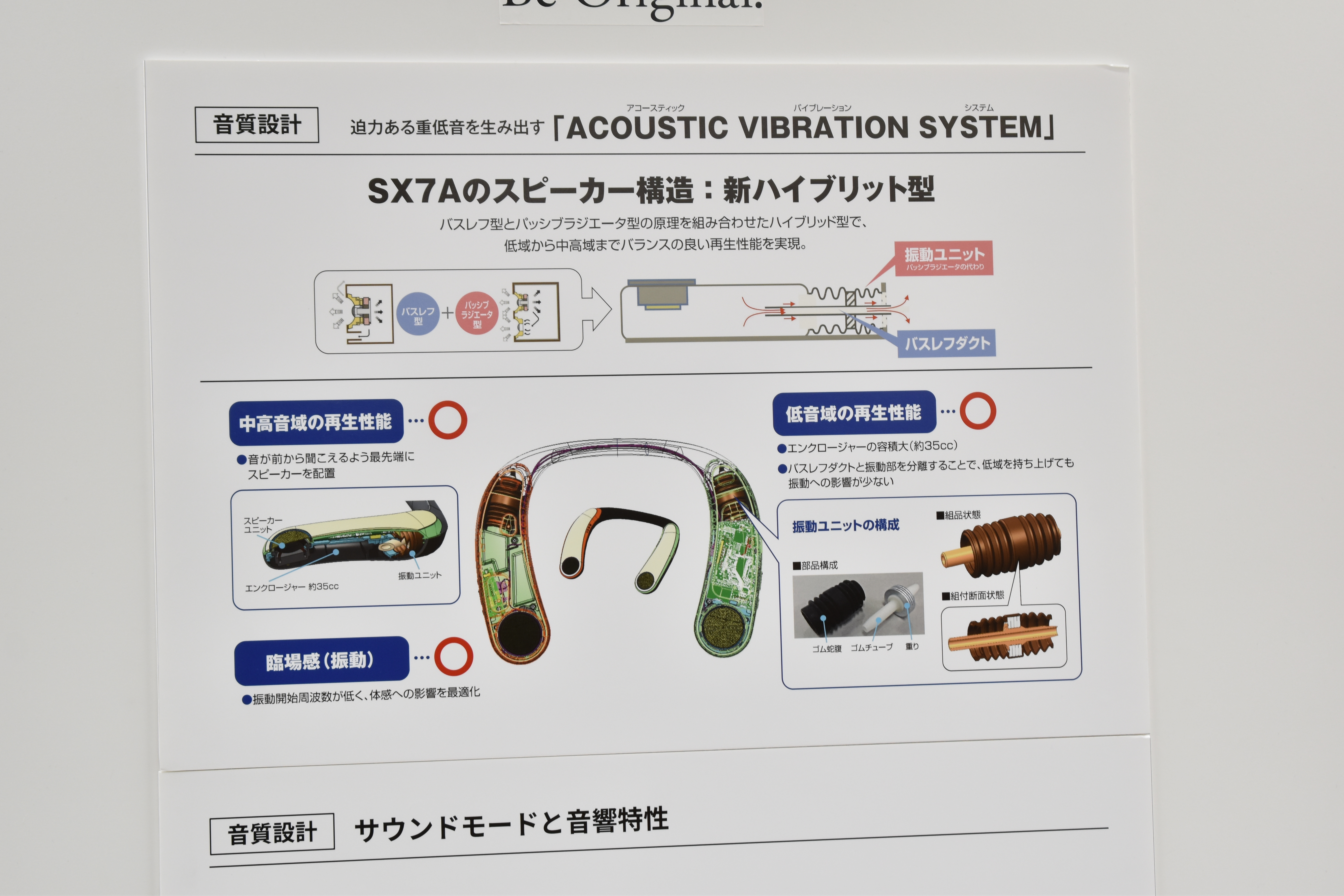 迫力のサウンドを実現したのは、独自開発の“ACOUSTIC BIBRATION SYSTEM”。蛇腹構造の振動ユニットが内蔵されていて、重低音に合わせて蛇腹が伸縮することで振動を生み出す仕組みです。またユニット内のバスレフダクトが低音をさらに増幅させ、重低音を作り出します。