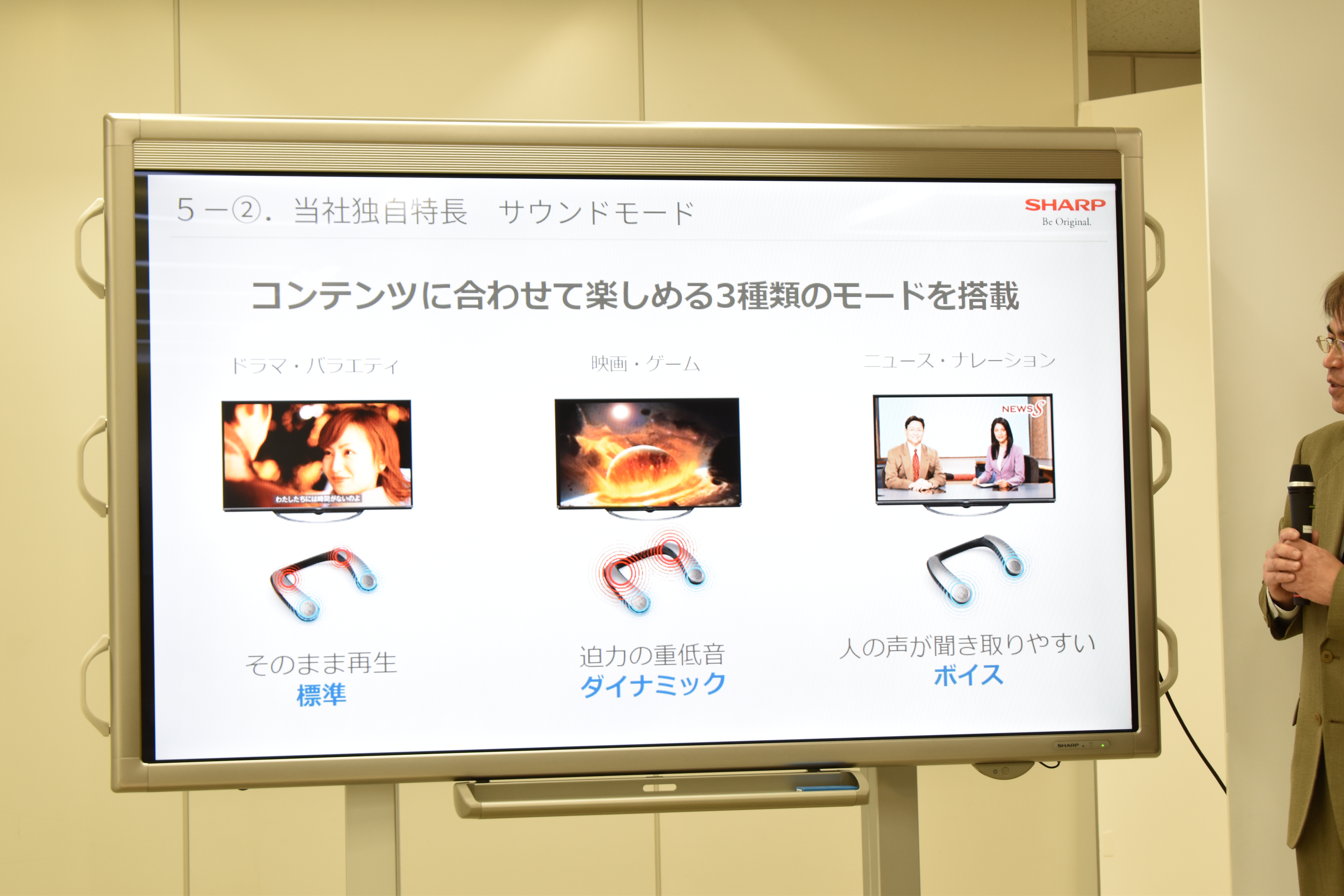 もう1つの特徴は、3種類のサウンドモードを搭載している点。ドラマやバラエティを見るときは「標準」モード、映画やゲームの臨場感を楽しみたいときは「ダイナミック」モード、ニュースやナレーションなど人の声をよく聴きたいときは「ボイス」モードというように、視聴するコンテンツに合わせて選択できます。