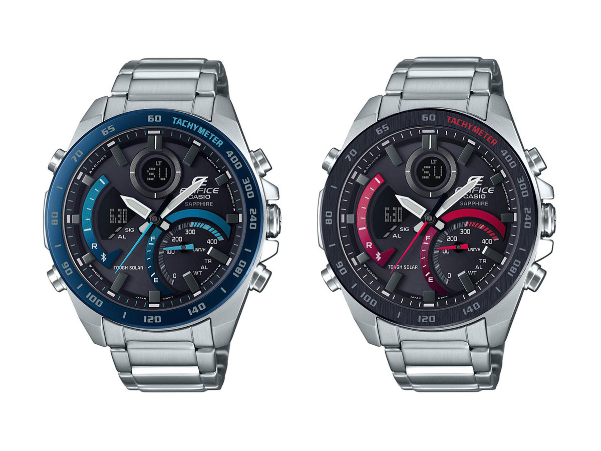 このアナログウォッチの長所にデジタルの機能性を融合させたのが、カシオのスポーツクロノグラフ・EDIFICE(エディフィス)シリーズです。最新モデル「ECB-900YDB」(4万円/税別)では、Bluetoothを介したスマホ連携で、高精度の時刻表示を実現。モータースポーツを思わせるデザインに多彩な機能を搭載した、スポーティなアナログクロノグラフです。