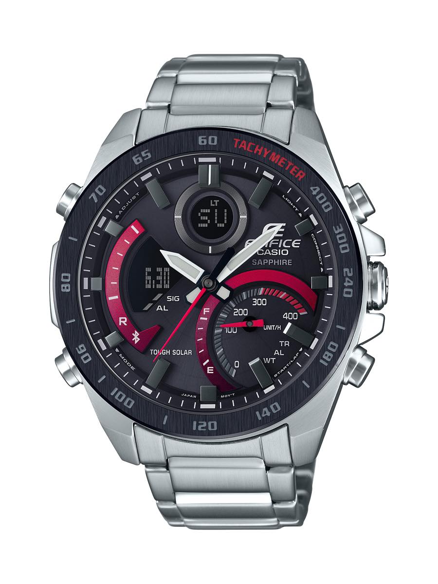 若々しく躍動感のあるデザインとカラーリングで、ベゼルにはタキメーターを採用。12時・9時に配置したLED液晶によるデジタル表示、4時位置に配置したグラデーション塗装の立体インダイアルなど、随所にレーシングスポーツをイメージした演出が光ります。