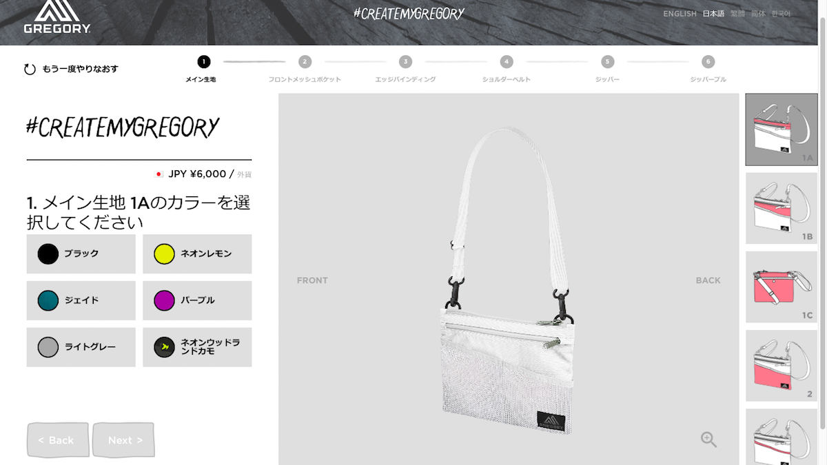 3月8日より開設されている特設WEBサイトでは、バッグのメイン生地、フロントメッシュポケット、エッジバインディング、ショルダーベルト、ジッパー、ジッパーブルの計6種類をサイト上でシミュレート、お気に入りの配色パターンが見つかるまで、自由にカラーを選択し直すことができます。