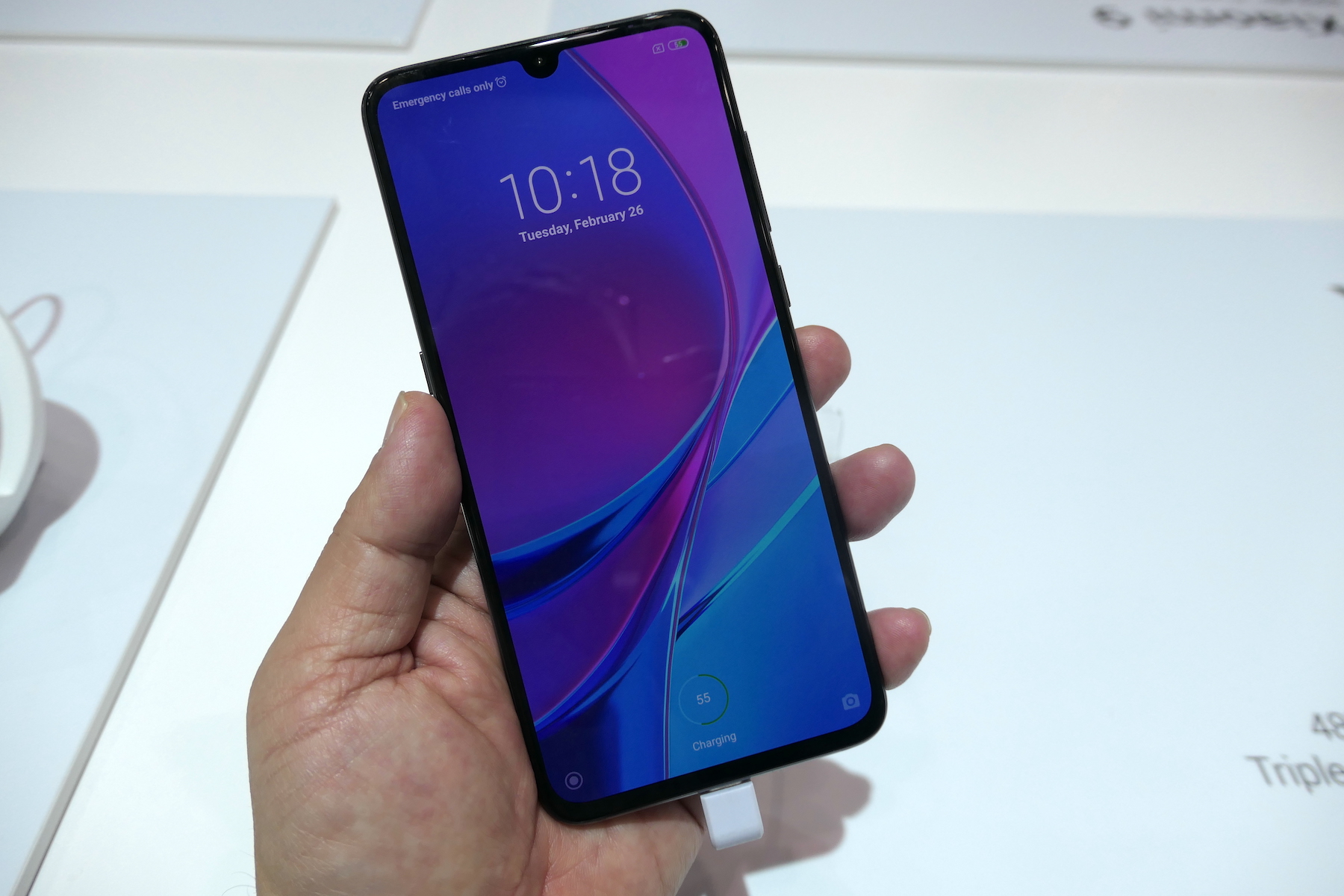 ▲中国メーカー・Xaiomiが発表した「Mi 9」。6.39インチの大画面ディスプレイは指紋センサーも内蔵している