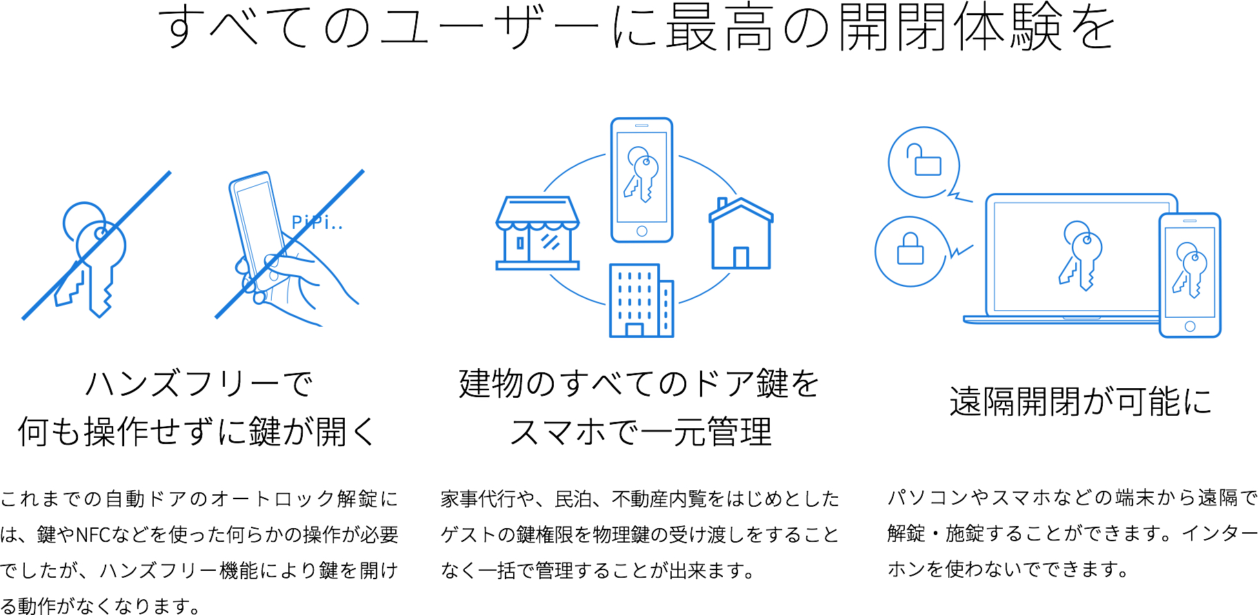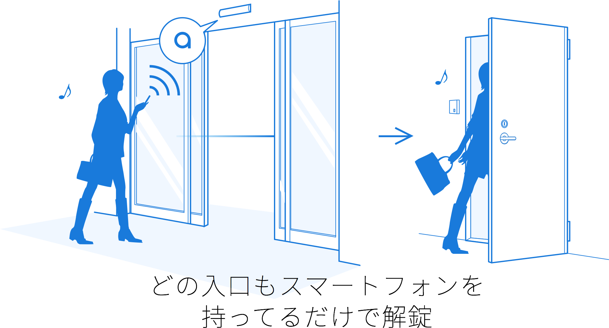 玄関ドアに加えてエントランスの自動ドアも「Akerun」にすれば、エントランスから玄関ドアまでスマホのみで通過することができるようになり、利便性がさらに向上する。
