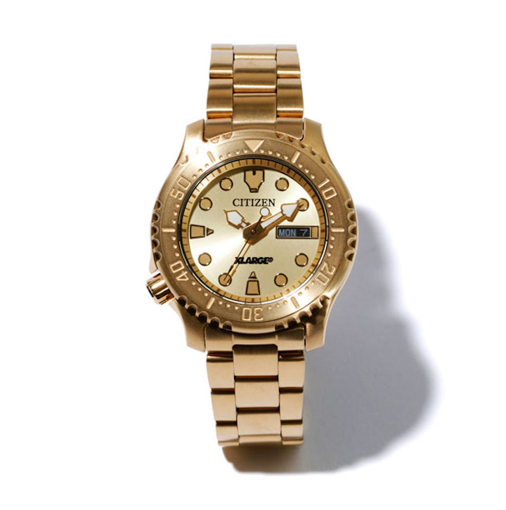 そんなXLARGEとCITIZEN初のコラボウォッチは、ケースとバンドともにオールゴールドのまばゆい一本。ストリートファッションの軽やかさとラグジュアリーさが融合した、コーディネートのアクセントにもぴったりのデザインです。