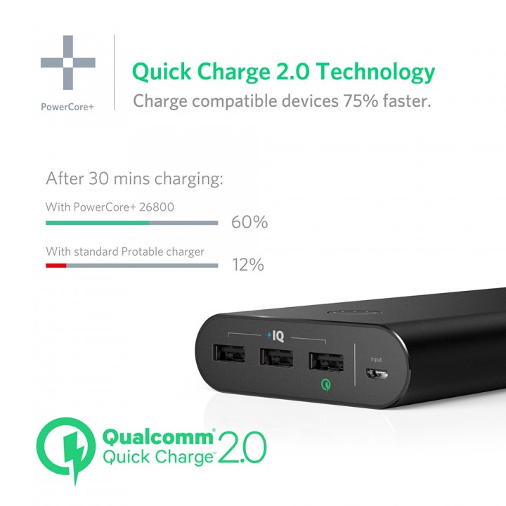 - Qualcomm製Quick Charge2.0技術により充電効率75%アップ