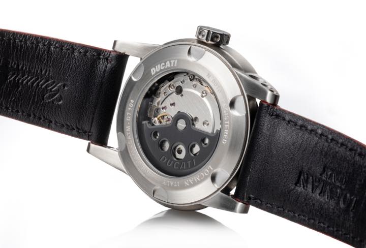 ねじ込み式のリューズとダイヤルの6時位置(「オートマチック クロノグラフ」のみ4時位置)には“DUCATI”のロゴが燦然と輝きますが、もうひとつ目を惹くのは、12時から3時の範囲に配したカラーバンド。メーターパネルなど、モーターレースの世界観から着想を得た、明快でユニークなデザインが魅力的です。