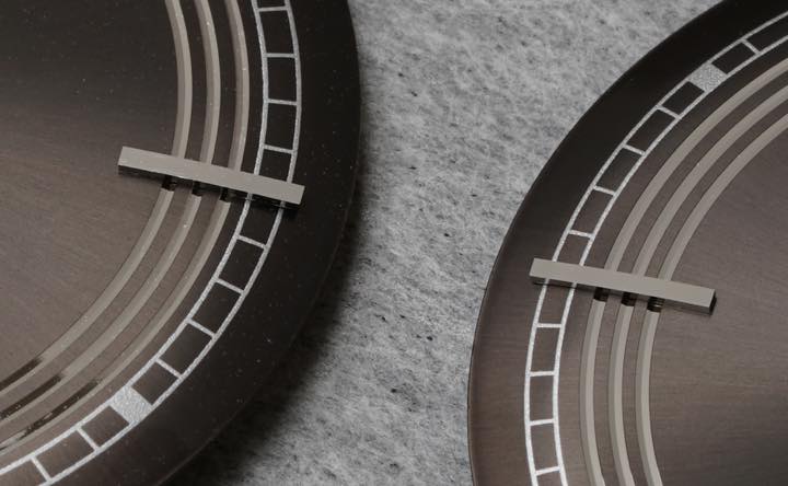 このモデルには、製造に手間のかかるボンベダイヤル(文字盤中央が盛り上がっている)を採用。中央部は緩やかなカーブ、 そして外周部が急激に落ちている形状が特徴で、 ボンベダイヤルと組み合わせると針のクリアランスを保ったまま、 外観を薄くできるメリットがあります。