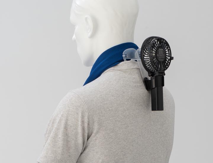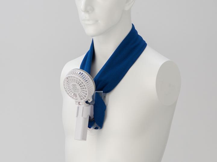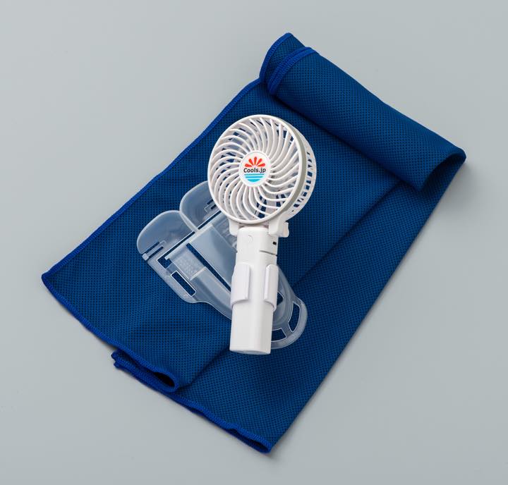 屋外での暑さ対策に便利なポータブル扇風機。ここに水で濡らした冷却タオルをプラスすると、体感温度が何度変わると思いますか? なんとマイナス6度も冷えるんです。