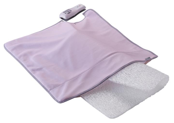 排気部には、アロマカートリッジも取り付けられているので、お好みのアロマオイルをたらせば、優しい香りに包まれてさらにリラックス効果も高まります。特に汗をかきやすい背中や腰のあたりをメインとした薄型のハーフサイズ(W1000×D1000×H70 mm、マット厚25mm、重量2.5kg)なので、どんな寝具にもぴったりフィット。