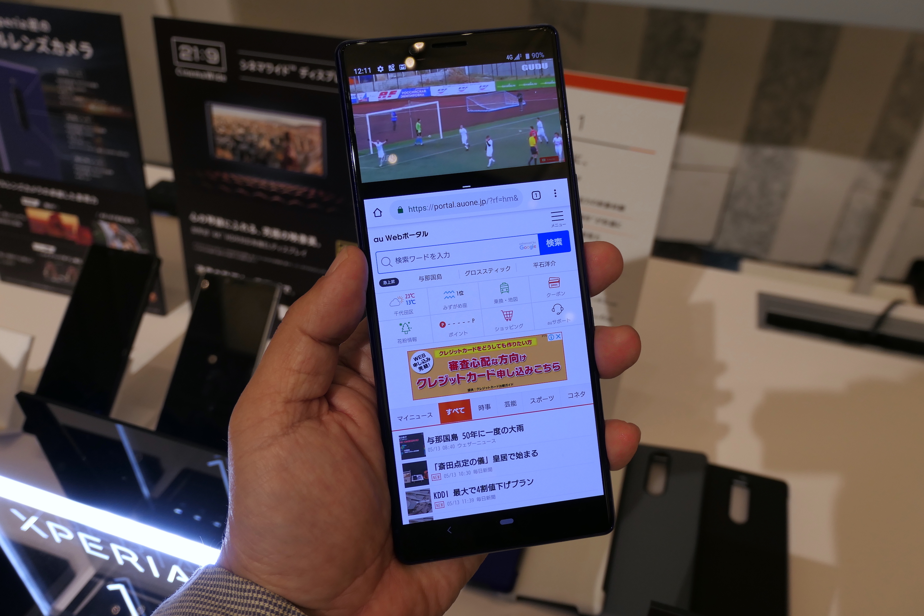 ▲インカメラも画面内に搭載することで、93%を超える高い画面占有率を実現。この端末は約6.4インチ画面のGalaxy S10+だが、横幅は約74mmに抑えられており、片手でもしっかりつかめる