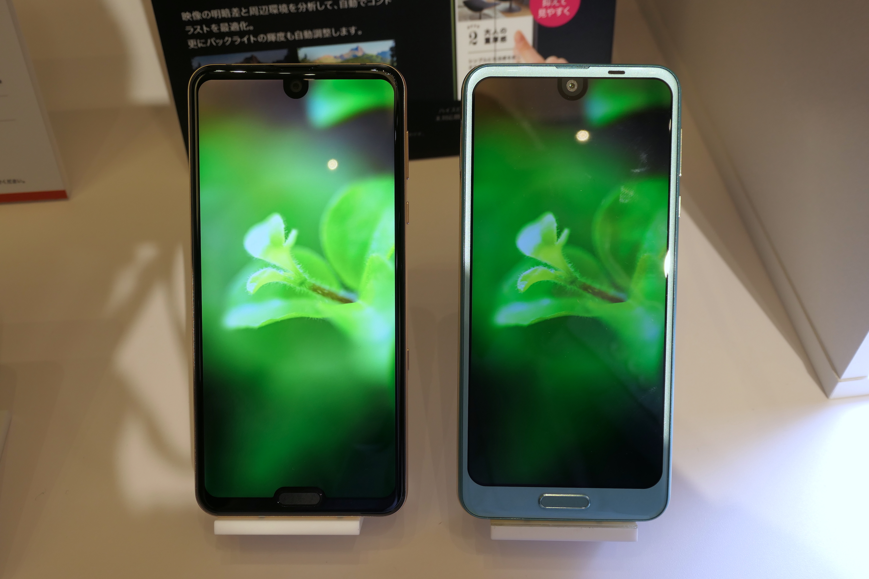 ▲前モデル・AQUOS R2(右)と同じ画像を表示して比べてみた。明るい表示でき、従来は暗くつぶれがちだった部分の色の階調まで表現できるようになった