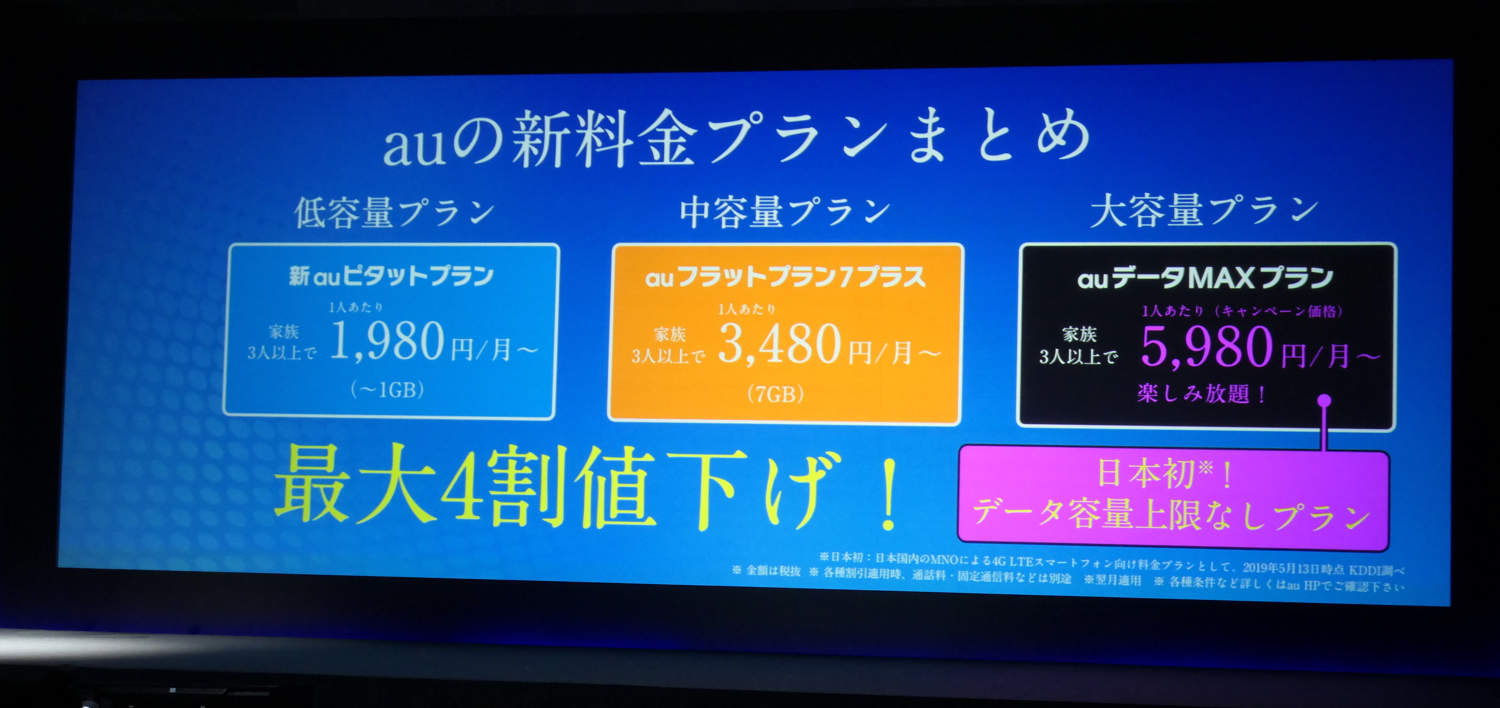 夏モデルの発表に合わせて、auは現行の料金プランよりも最大4割程度安くなるという新プランも発表しました。たとえば、段階式の「新auピタットプラン」の場合、「auスマートバリュー」や「家族割プラス」などが適用されると月額1980円。7GBまで使えて、Facebook、Instagram、Twitter、+メッセージがカウントフリーになる「auフラットプラン7プラス」は、最安の場合は月額3480円。さらに、夏からは最安の場合は月額5980円(当初6か月間)でデータが使い放題になる「auデータMAXプラン」の提供も始まります。