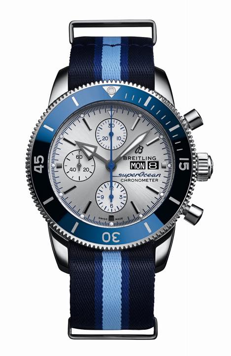 日付表示下に添えた「Superocean」の文字、ニッケルメッキをあしらい同色系で統一したサブダイアルやクロノグラフ針など、シルバーとブルーでまとめたカラーリングが清潔感を漂わせます。