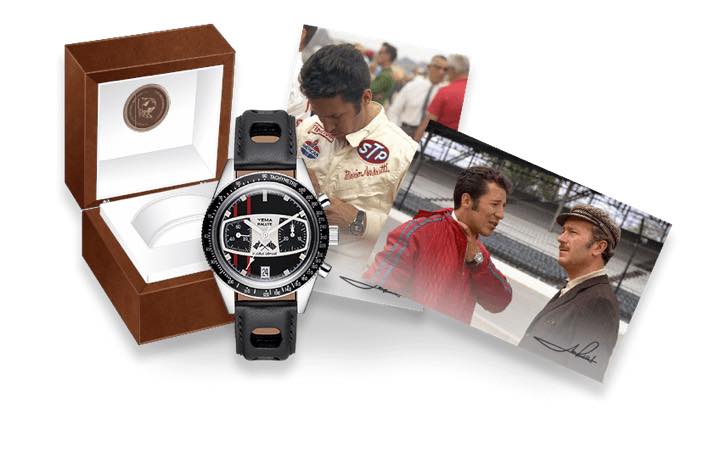 今回発売となる「ラリーアンドレッティ リミテッドエディション」(34万円/税別)には付属品として、彼の輝かしい経歴を称える記念メダル、1969年のインディ500レース時に撮られた彼の写真が2枚(腕にはもちろんラリーが)、そして、3つの穴が空いたラリースタイルのレザーストラップが3本同梱(黒、ダークブラウン、ライトブラウン)。また、高級感あふれる特別仕様のレザーボックスも付属。