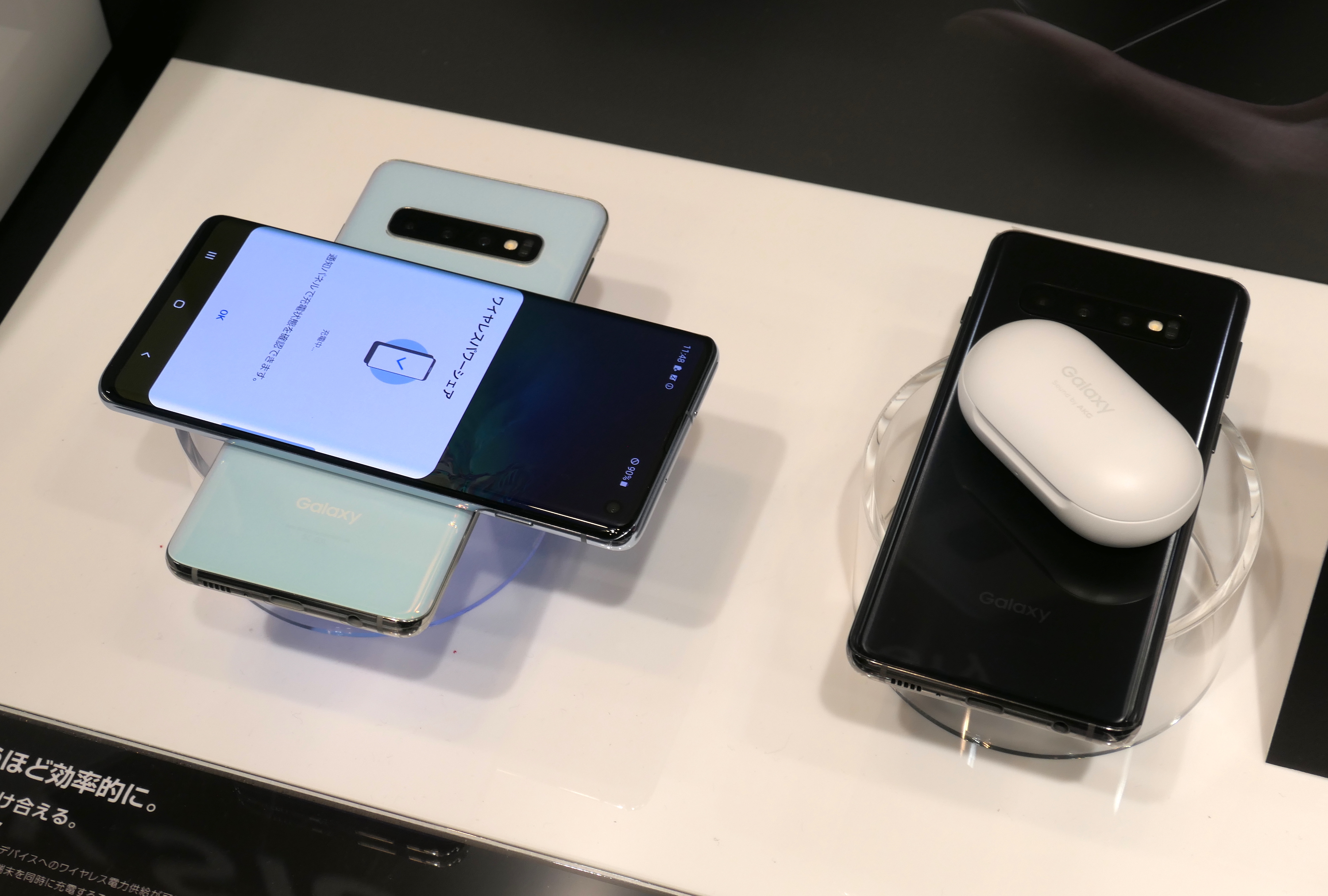 ▲Qi対応機器に逆充電することも可能。右のワイヤレスイヤホン「Galaxy Buds」は予約購入者は申し込むと全員にプレゼントされる
