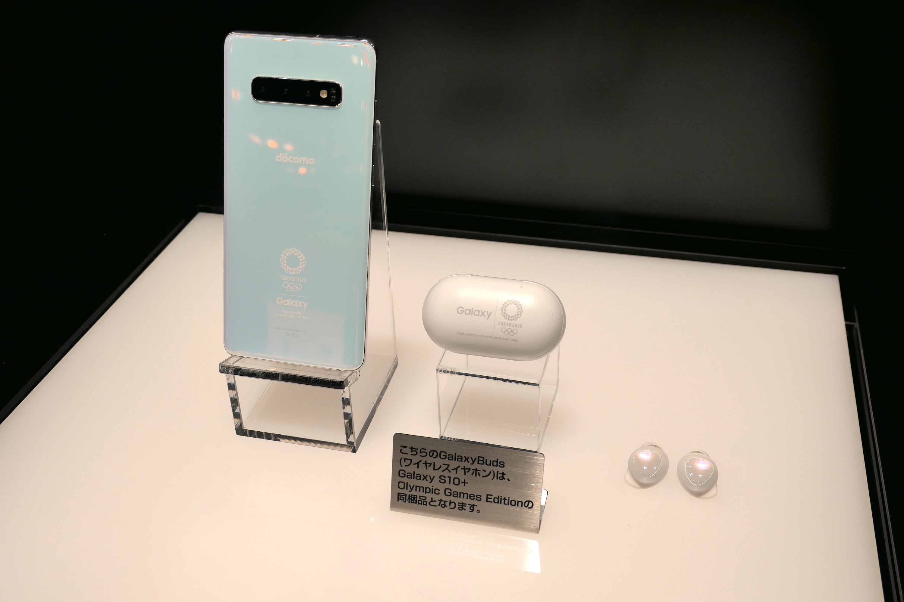Galaxy S10+の背面に東京オリンピックのロゴをあしらった1万台限定モデル。限定デザインのワイヤレスイヤホン「Galaxy Buds」も付属します。