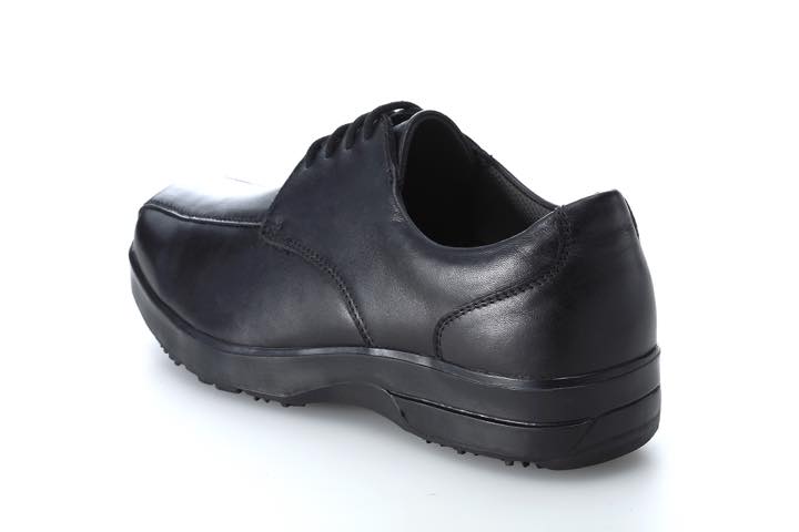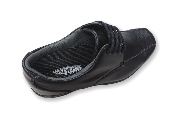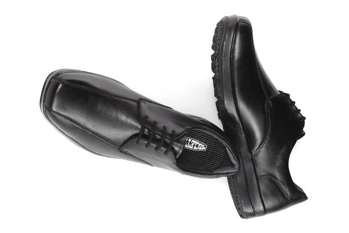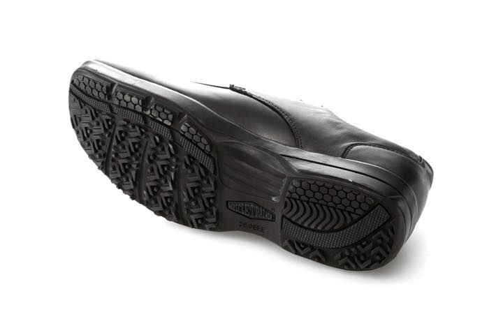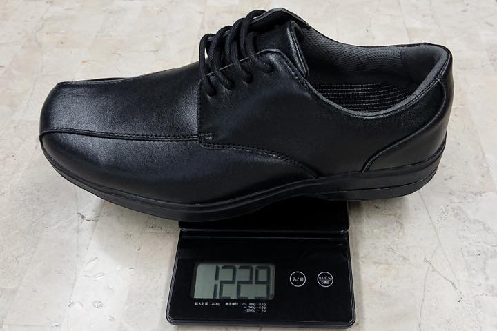 外見はいわゆる普通のビジネスシューズで、片足だけで1.2kgあるとはまず想像が付かないシルエット。アッパーは牛革素材で、カラーはブラックのみ。サイズは24.5cm〜28.0cm(27.5cmを除く)で展開され、ワイズは足先ゆったり目の3Eとなっています。