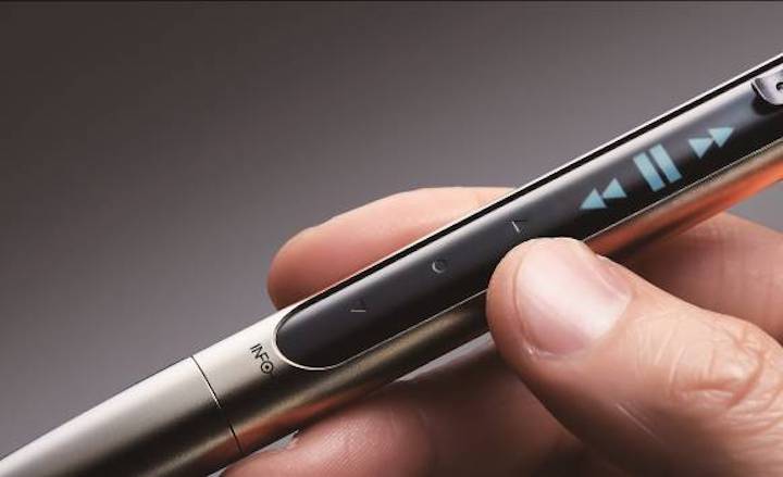 さらに、ペン本体のタッチボタンでスマホを操作することも可能。たとえば、音楽アプリの曲の再生/一時停止、曲送り/曲戻しといった操作や、カメラアプリのシャッター操作のほか、ペアリングしているスマホが見当たらないときには、「インフォ」を使って呼び出し、見つけることができます。