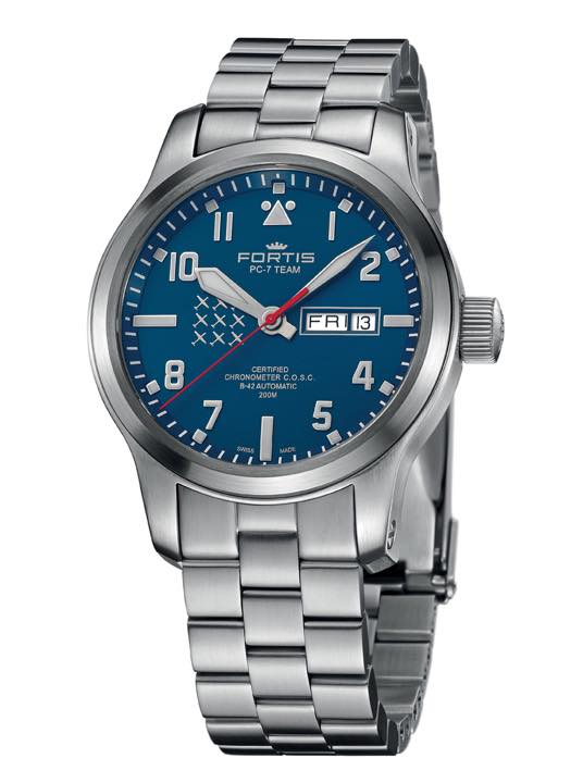 「PC-7チーム エアロマスター デイデイト」(27万円)は、デイデイト表示を英語とドイツ語の2種類から選択。ムーブメントはETA2836-2で自動巻38時間駆動です。