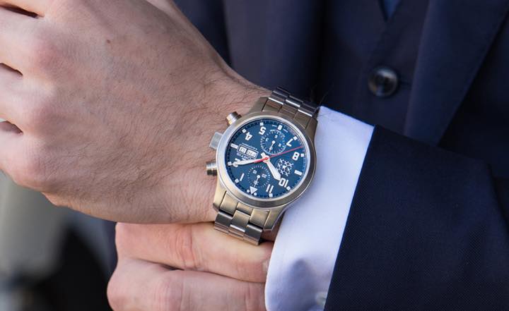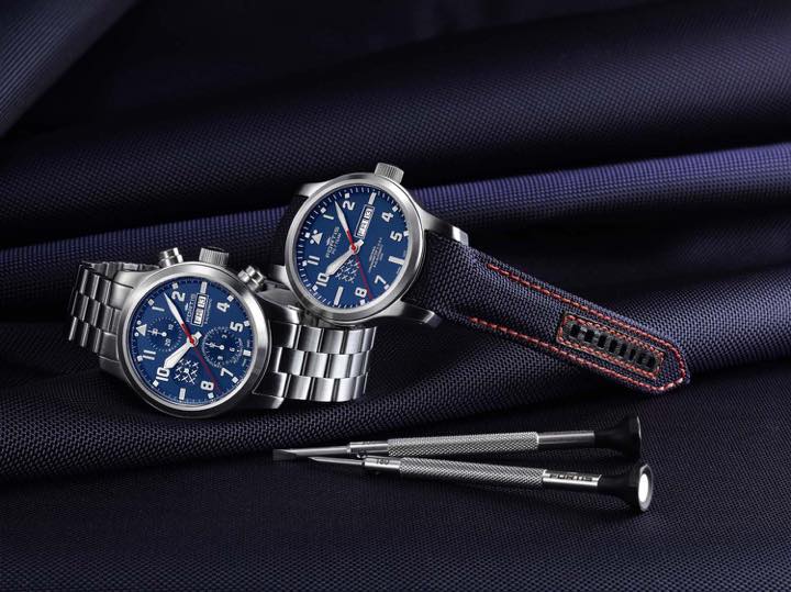 「PC-7チーム エアロマスター クロノグラフ」(52万9200円)は、30分積算計と12時間計のクロノグラフ搭載モデル。ムーブメントはValjoux7750で自動巻48時間駆動、ステンレススチール製ケースでサイズは42mm径×厚さ15.5mm。