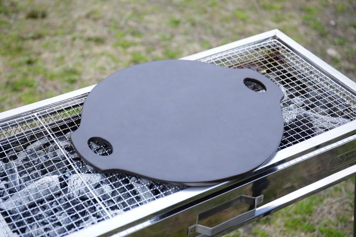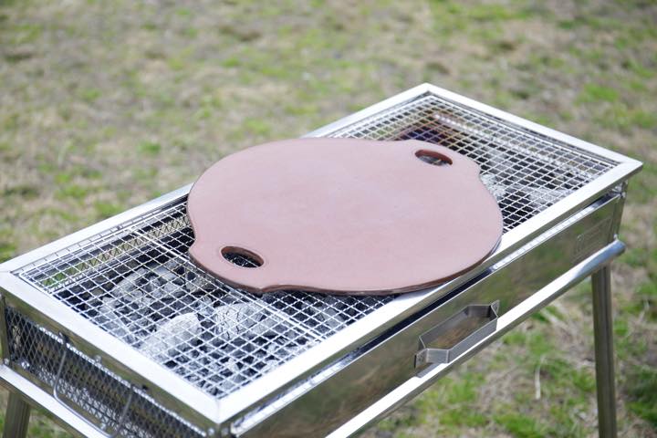 また、陶板なので遠赤外線効果で食材にじっくり火が通り、水分の減少も抑えます。そのためお肉や野菜がふっくらジューシーに仕上がるんです! しかも土でできた焼き物なので鉄板のようにサビの心配もいりません。フラットなデザインでお手入れもラクラク。重量も1.9kgと女子会BBQでも持っていきやすい重さです。