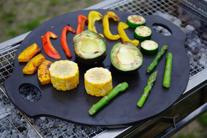 網の上に載せても、ファイヤーグリルなどに直接載せても使えるのがウレシイところ。網で肉を焼きながら「TOBAN バーベキュー用陶板」で野菜を焼く、餃子を焼く、クッキングシートで包み焼きなど使い方はさまざま。これまでのBBQではできなかった料理も楽しめるようになります。