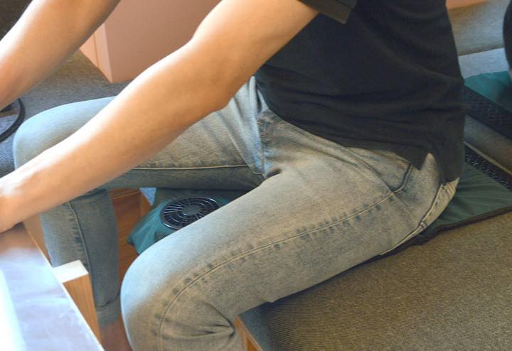 USBケーブルを差し込むとファンが回転し、座面の中を空気が心地よく通り抜けるので、背中やお尻の蒸れを防止し、快適さを保ちます。さらにファンの風で汗が乾く際に熱を奪う “気化熱” で涼しさが倍増。これなら、暑がりの方でも周囲に気を遣わず、いつでも涼しい顔でいられそうです。