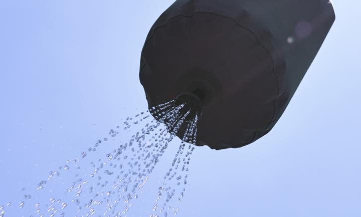 「エアライトシャワー」コンパクトサイズで持ち運びができる簡易シャワー。本体の重さはたった150gと超軽量! 本体には最大9Lの水が入り、 約5分間シャワーが使用できる。木やポールにぶら下げてもいいし、手持ちで使用することもできる。