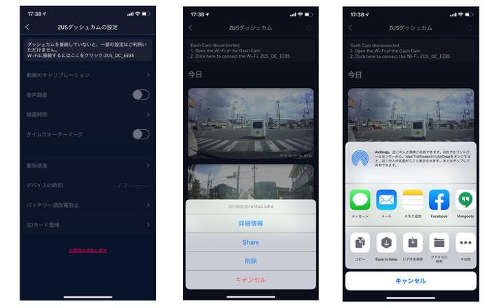 そしてこの「ZUSスマートダッシュカム」の最大の特徴は、Wi-Fiで接続することで、スマホから操作や管理ができること。直感的に使いやすい専用アプリを使って、初期設定のほか、音声録画の有り無しや、1回あたりの連続録画時間、録画済み動画の閲覧やダウンロード、共有、削除などをスマホの画面上で設定・操作できます。