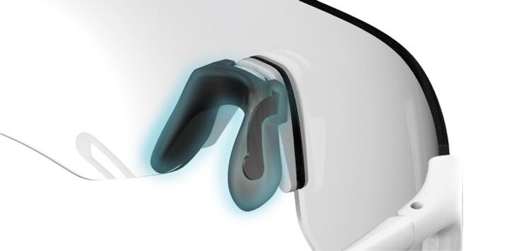 後頭部にあたるテンプル内側には、走行時の上下振動により起こるアイウエアのずれを防ぐ「ノンスリップラバー」を採用。ノーズパッドの内側には、鼻の形状に合わせてパッドを広げたり狭くしたりと調整できるフィッティングシステムを備えている。
