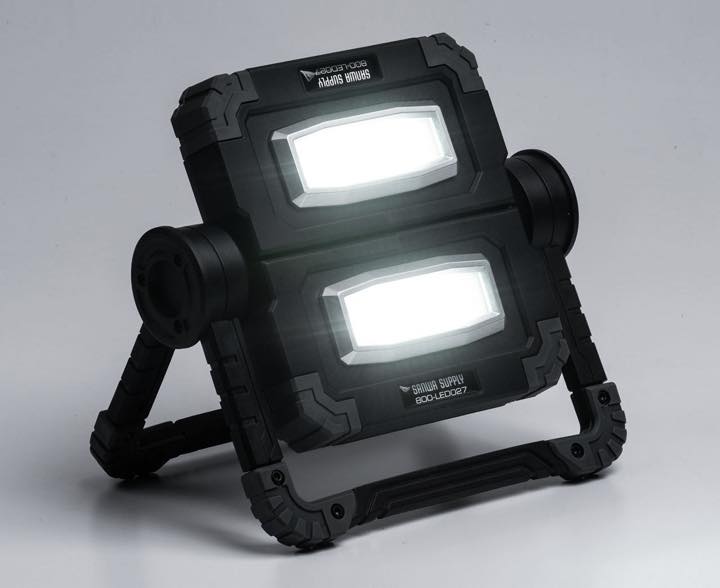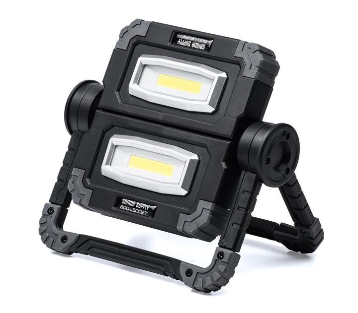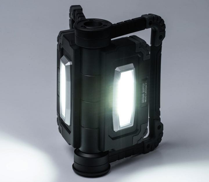 サンワサプライから新登場の「LED投光器」は、バッテリー内蔵のUSB充電式LED投光器。COBチップの面発光LEDを2灯使用し、最大850ルーメンの明るさで暗闇を強力に照らします。