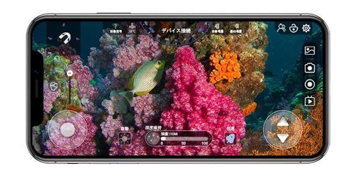 付属のコントローラー以外にも、専用アプリ「Youcan Dive」を使えばスマホやタブレットでも操作ができます。そのまま水中映像をリアルタイムで鑑賞できるほか、撮影した画像や映像をSNSに投稿したり、シェアすることも簡単。