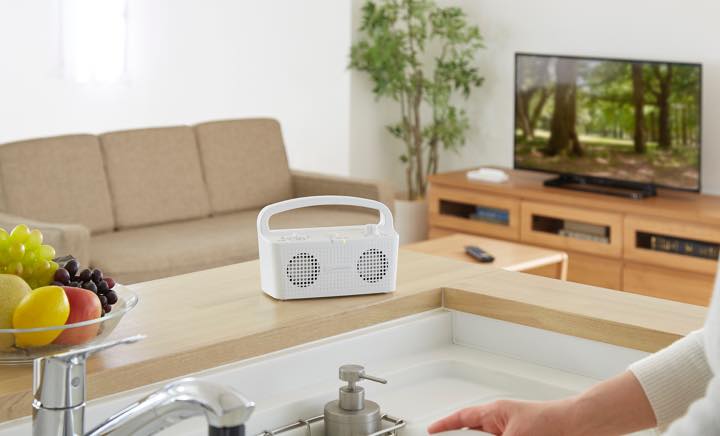 イヤホンとは違い、複数人で楽しめますし、電話やチャイムなどの音もしっかり把握しながら使用できます。防滴仕様なので、キッチンスペースで洗い物をしながらなんて場合でも安心。スピーカー部は充電式で約16時間駆動。ホワイトとブラックの2色で、6月14日より発売となります。