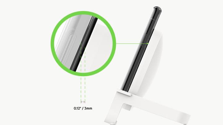 最大3mmまでのプラスチックケースに対応しているので、ケースを取り外すことなく充電できるのも便利。すべてのQi搭載の端末に対応し、iPhoneは7.5W、Galaxyは9Wという最大充電速度でワイヤレス充電が可能。