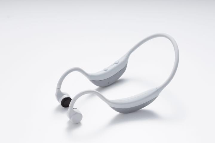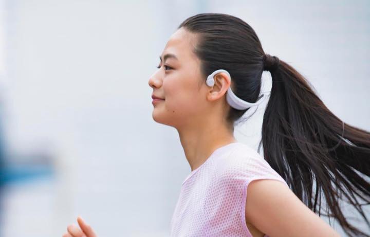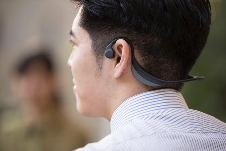 通常のイヤホンのイヤピース部分を両耳のこめかみのあたりに装着し、空気ではなく「骨」を震わせる骨伝導によって聴覚神経に直接音の振動を伝えるので、周囲の環境音もサウンドも両方聞くことが可能。屋外でのランニング時にはもちろん、ジムでトレーナーと会話しながら音楽も楽しんだり、ハイキングしながら自然の音と音楽に包まれたりと、これまでにない楽しみ方ができます。