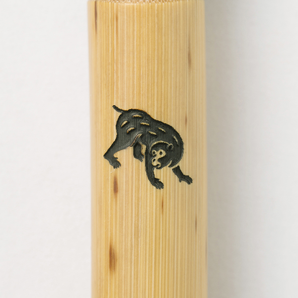 軸には天然の紋竹を使用。焼印された「猿」は、江戸時代の印籠に描かれたものがモチーフとなっているそう。穂先も筆職人による手作りと、日本のこだわりが詰まっています。