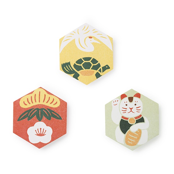 吉祥形の六角のぽち袋。松竹梅、鶴亀、招き猫といった縁起の良いモチーフが、温かみのある図柄で表現されています。伝統的なのに個性的なお年玉は、もらう人も嬉しくなりそう!