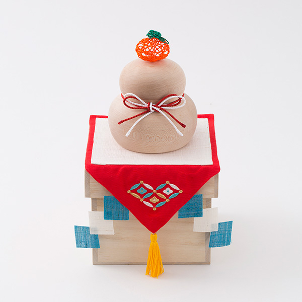 木製の鏡餅飾りです。博多水引の連続あわじ結びでつくられた「橙」が素敵。鏡餅の上に載せる橙には、「代々栄えるように」という願いが込められているそうです。