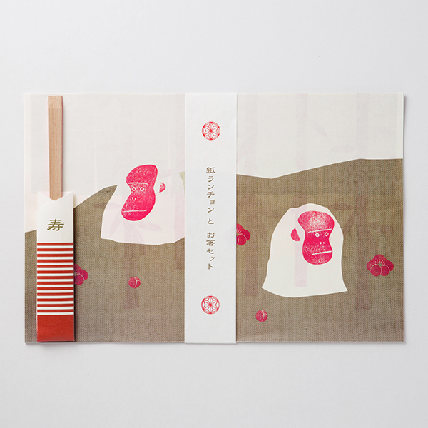 お正月なら食卓もドレスアップ! 来年の干支の申をはじめとした、おめでたい絵柄の紙のランチョンと、吉野杉の箸のセットです。