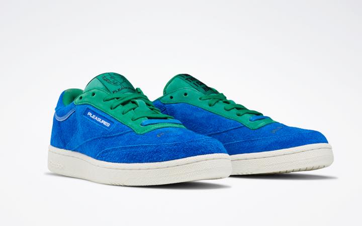今回のコラボモデル「PLEASURES CLUB C 85(プレジャーズ クラブ C 85)」(1万2960円)は、グリーンとブルーが融合した夏らしいカラーリングに。シュータンやトゥ部分に書かれた印象的メッセージや、通常 “Reebok” のロゴが入るサイド部分には“PLEASURES”のロゴが入るなど、コラボならではのデザインに仕上がっています。