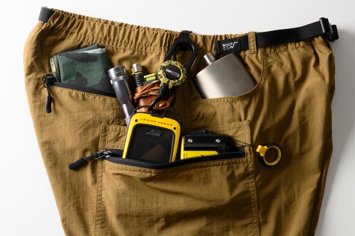 生地に薄手で軽量・速乾のSUPLEXナイロンを使用し、合計9つのポケット搭載と収納性は抜群。パンツの左右には、付属するオリジナルカモフラージュ柄の限定「MAG REEL 360(コードリールキーホルダー)」を吊り下げるループが配置されています。