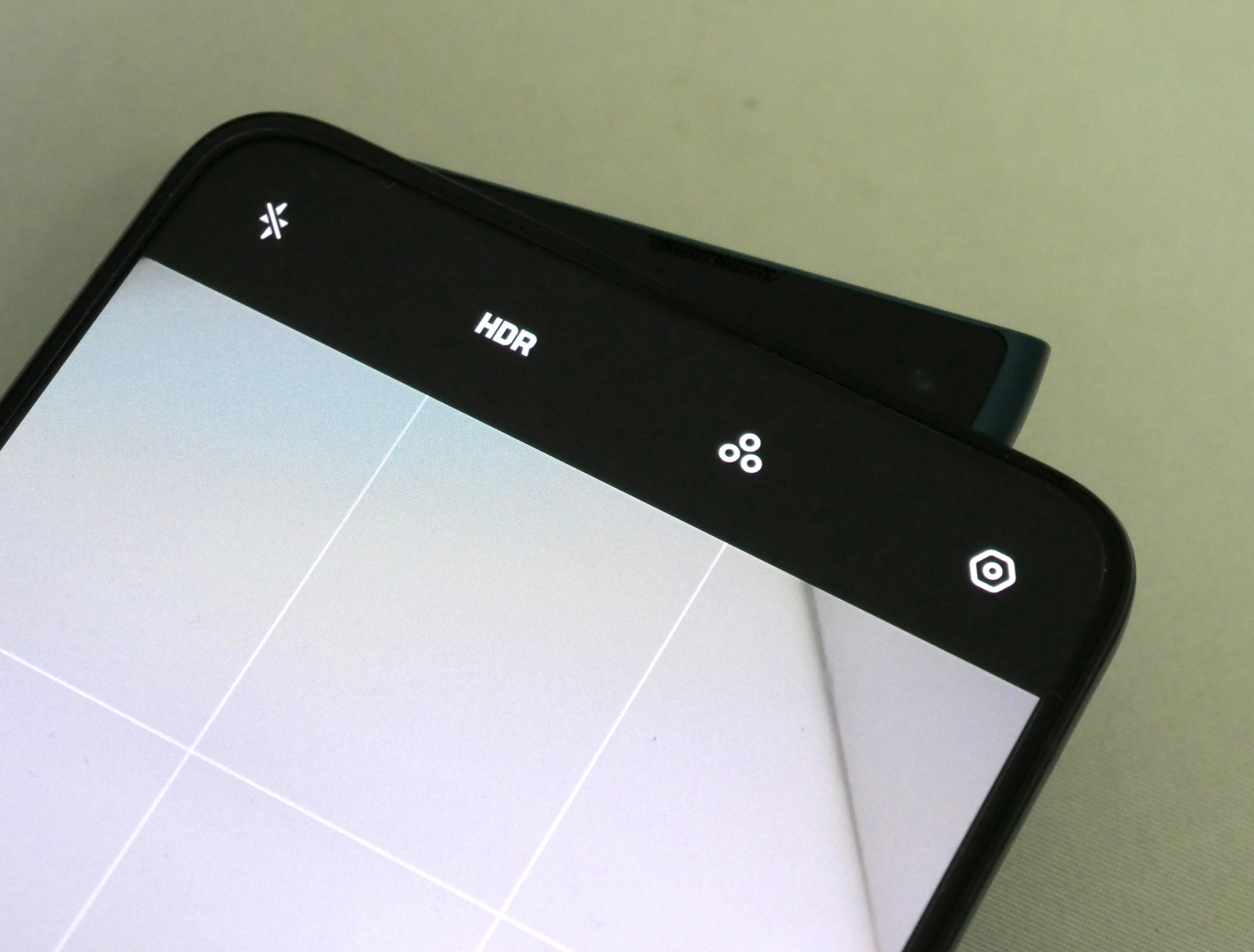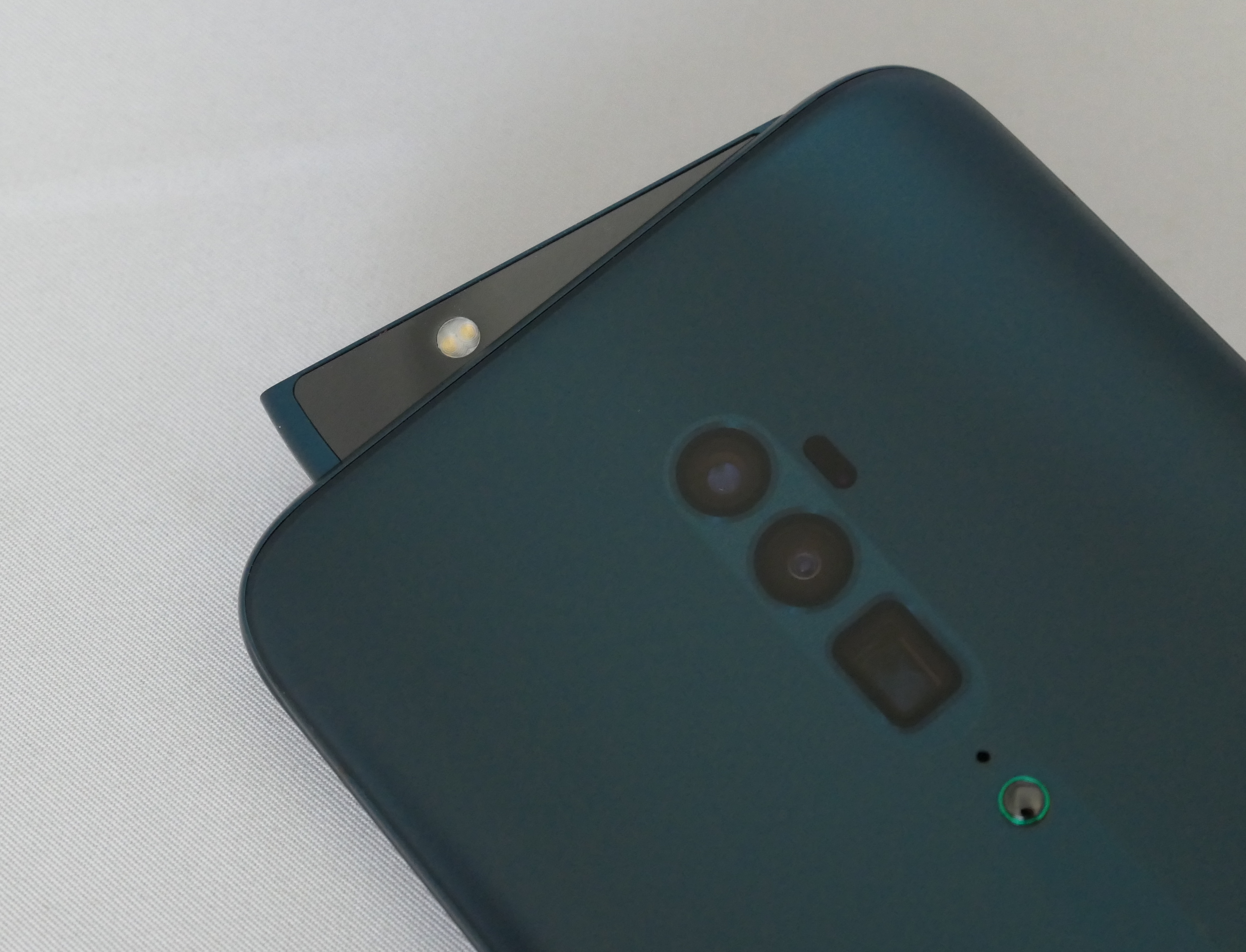 6.65インチの有機ELディスプレイを搭載するフロントパネルは、ベゼルが細く、ほぼ全面がスクリーン(画面占有率は93.1%)。インカメラは本体内部に隠れていて、使うときにだけリフトアップする仕様。「ピボットライジング機構」と呼ぶそうですが、音もなく出てきて、カメラが起動するまでの時間はわずか0.8秒。OPPOのスマホは、従来からインカメラの画質にも定評がありますが、この「Reno 10x Zoom」のインカメラも、老若男女を問わず、実際よりも若く健康的に見えるように盛ってくれます。
